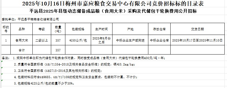 平远县2025年县级动态储备成品粮(食用大米)采购及代储包干轮换费用公开招标公告