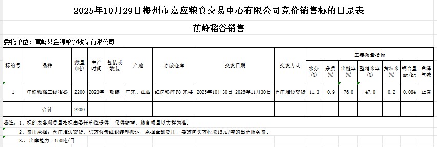 受客户委托,梅州市嘉应粮食交易中心有限公司定于2025年10月29日(星期三)举办粮食竞价交易会。蕉岭县金穗粮食收储有限公司拟销售2023年产中晚籼稻谷2200吨。