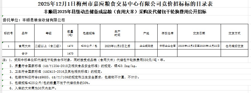 丰顺县2025年县级动态储备成品粮(食用大米)采购及代储包干轮换费用公开招标公告