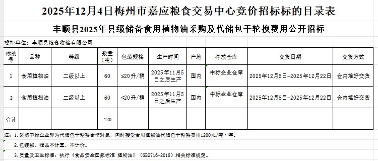 受丰顺县粮食收储有限公司委托,梅州市嘉应粮食交易中心有限公司定于2025年12月4日(星期四)上午10:00在广东省梅州市彬芳大道南161号梅州市粮食交易中心3楼,举办丰顺县2025年县级储备食用植物油采购及代储包干轮换费用公开招标。