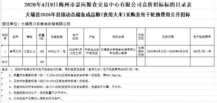 大埔县2026年县级动态储备成品粮(食用大米)采购及包干轮换费用公开招标公告