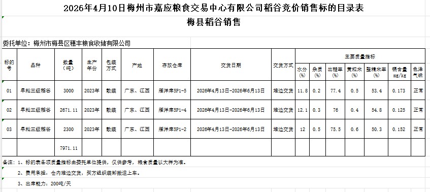 受客户委托,梅州市嘉应粮食交易中心有限公司定于2026年4月10日(星期五)举办粮食竞价交易会。梅州市梅县区穗丰粮食收储有限公司拟销售2023年产早籼稻谷7971.11吨。