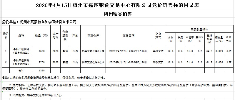 受客户委托,梅州市嘉应粮食交易中心有限公司定于2026年4月15日(星期三)举办粮食竞价交易会。梅州市嘉泰粮食和物资储备有限公司拟销售2023年产早籼稻谷(圆身短粒型)4350吨。