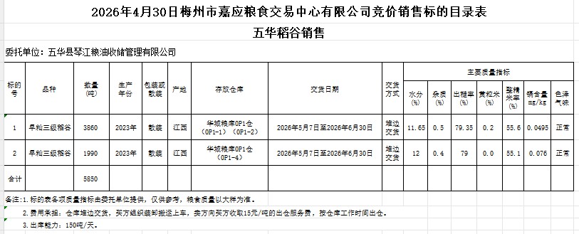 受客户委托,梅州市嘉应粮食交易中心有限公司定于2026年4月30日(星期四)举办粮食竞价交易会。五华县琴江粮油收储管理有限公司拟销售2023年产早籼稻谷5850吨。